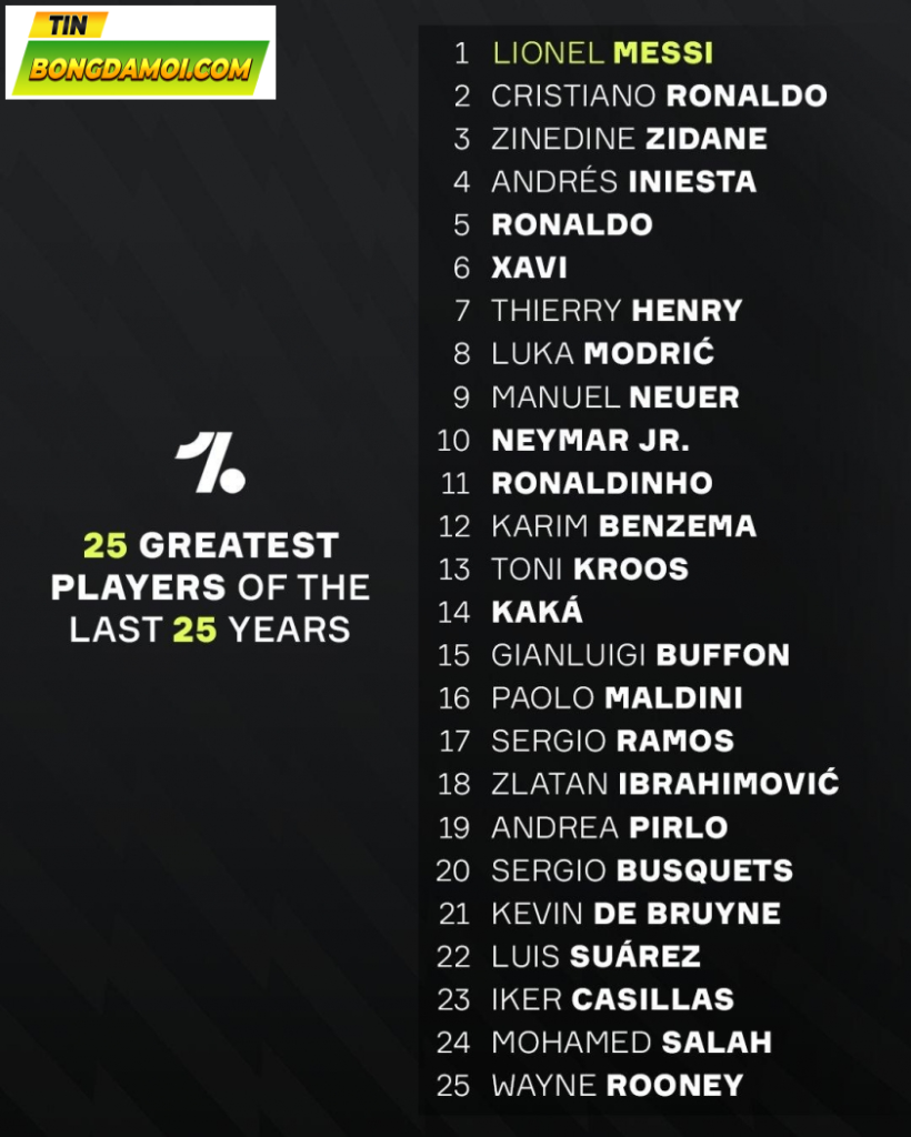 Chuyên trang tin tức thể thao 24h đã công bố danh sách lựa chọn cầu thủ xuất sắc nhất trong 25 năm đầu tiên của thế kỷ 21.